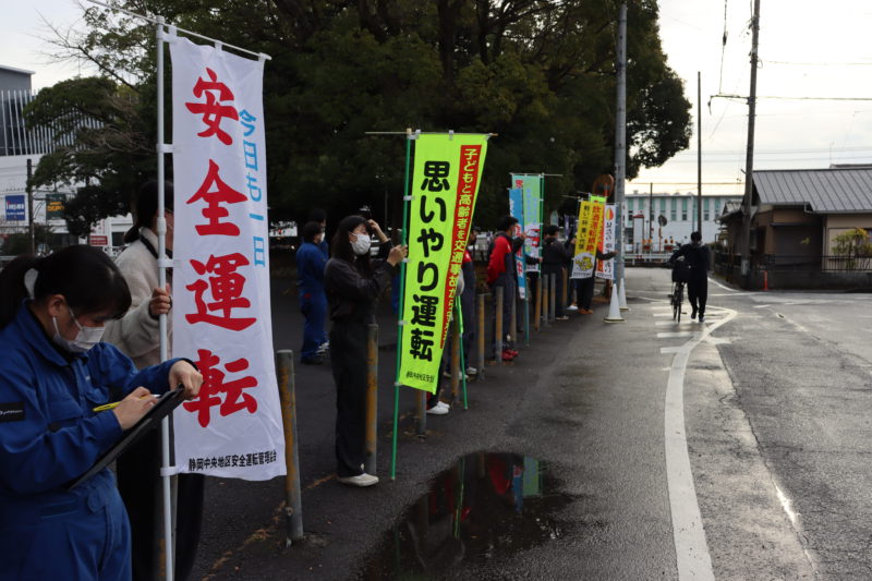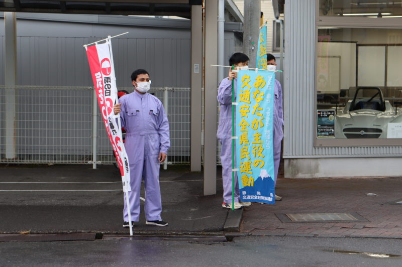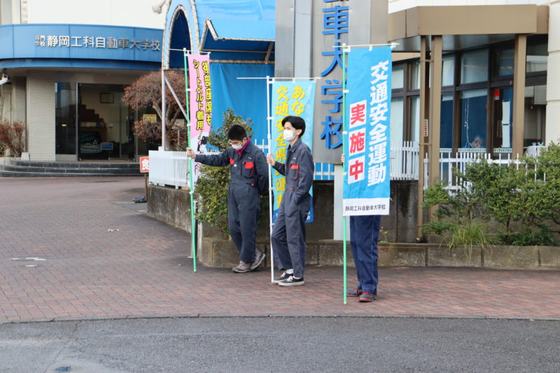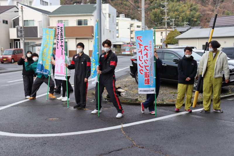本日1月11日(火)交通安全のための交通立哨を行いました。例年年末の交通安全運動に協力しているのですが、予定日が雨天だったために本日にスライドしたものです。本日の朝、学生自治会の担当教員と自治会本部役員が集まりのぼり旗を掲げました。自動車に携わる本校も、交通立哨という形で運動に協力します。(yagawa)