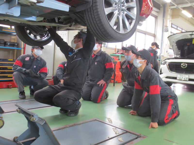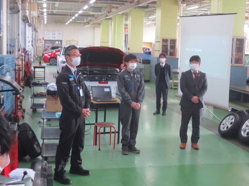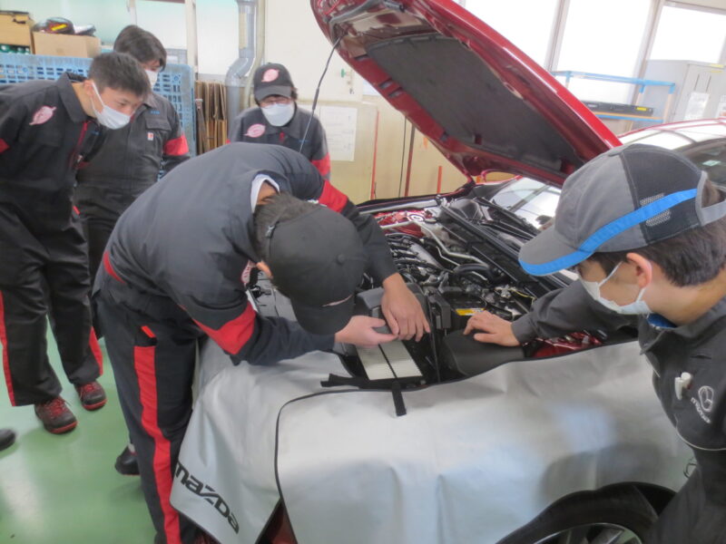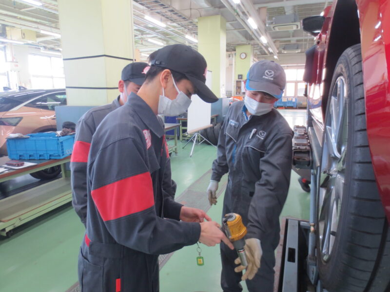 1月12日に行われた静岡マツダ様による企業実習の様子です。自動車整備科の2班が受講しました。直接実習場でご挨拶、概要説明をいただいた後、車両の確認、点検作業を行いました。プロの手さばきに学生も真剣です。静岡マツダ様ありがとうございました。(yagawa)