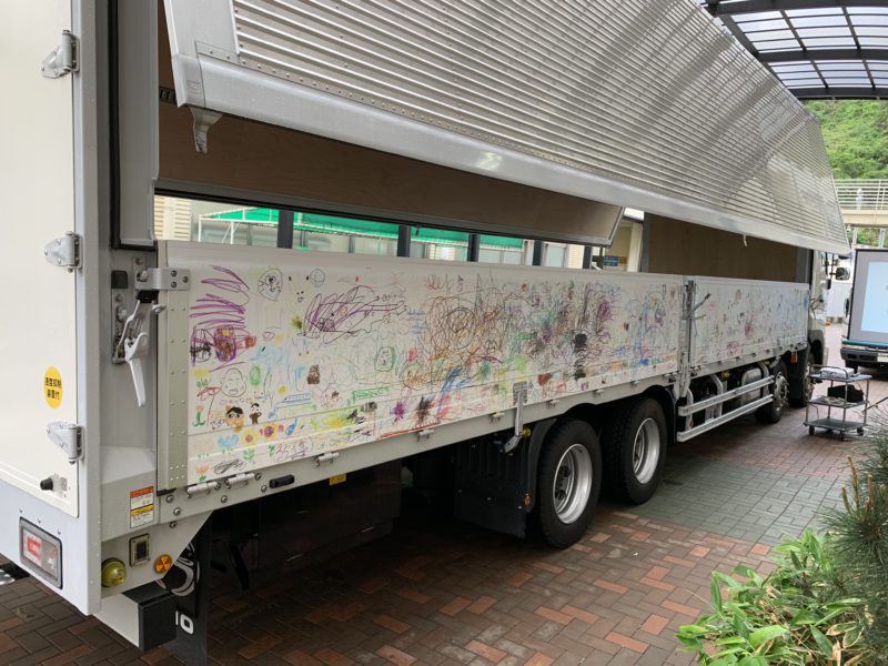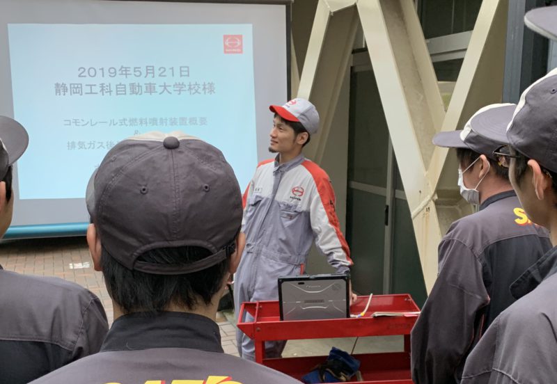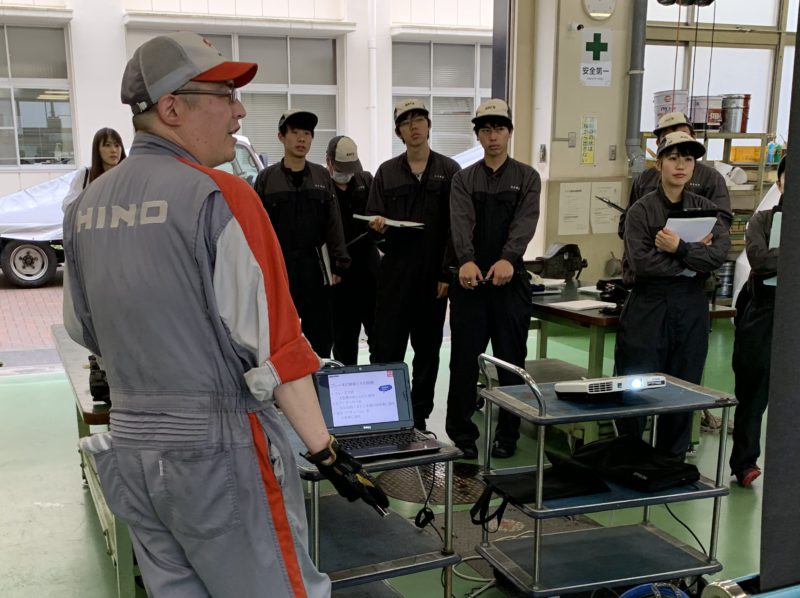 自動車整備科・自動車システム工学科の2年生が受講する「企業様を招いての実習授業」が本年度も行われました。5月21日静岡日野様にお願いしました。この日静岡は大雨で交通網は乱れ朝遅刻してくる学生が続出。そこで午前中の予定だったものを急きょ午後に変更していただき実施。コモンレールシステムやエア・ブレーキのシステムの説明をしていただきました。トラックの側面には何かのイベントに参加したのでしょう。かわいいイラストが・・・(yagawa)