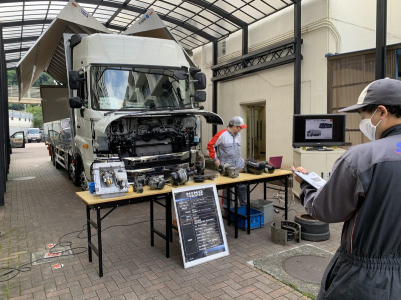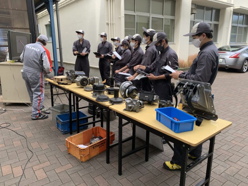 自動車整備科・自動車システム工学科の2年生が受講する「企業様を招いての実習授業」が本年度も行われました。10月2日静岡日野様にお願いしました。最初の座学ではPCSなどの安全技術を学び、その後2グループに分かれて、一方はミリ波レーダー画像センサのエーミング作業、もう一方はBBS・ブレーキ回路の説明を受けその構成部品の確認を行いました。中央通路に鎮座する大型トラックも迫力満点です。(yagawa)