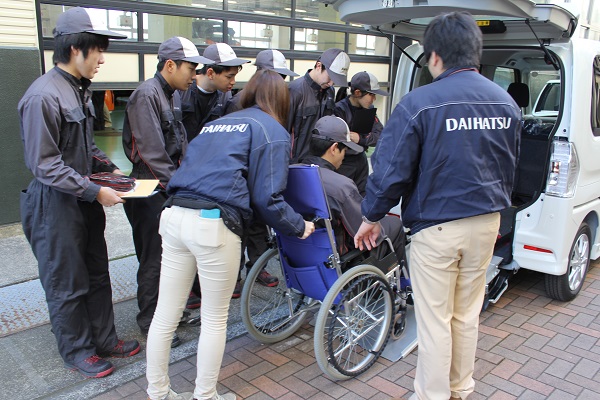 そして福祉車両では学生が実際に車イス乗り、乗せ方などを教えていただきました。操作は簡単で女性でも移動がスムーズです。シートベルトや車いすの固定の仕方なども詳しく教えていただきました。