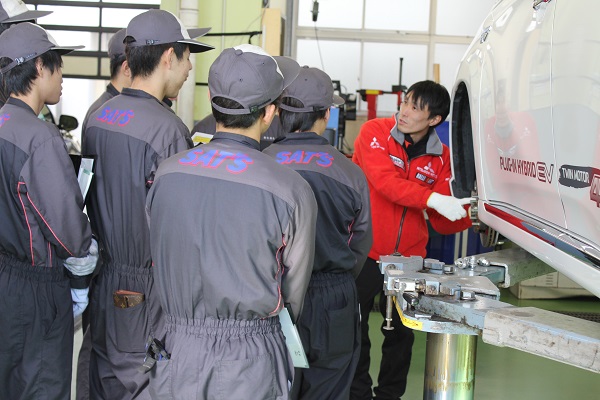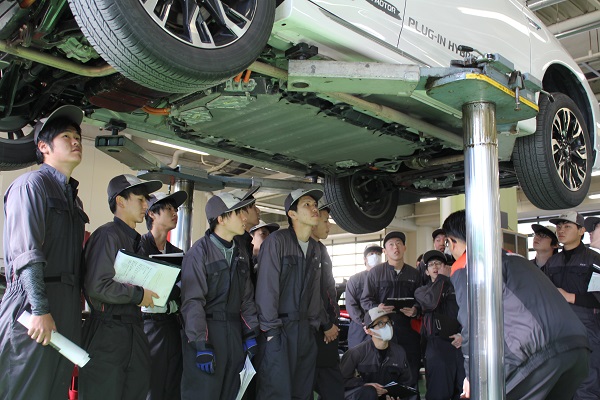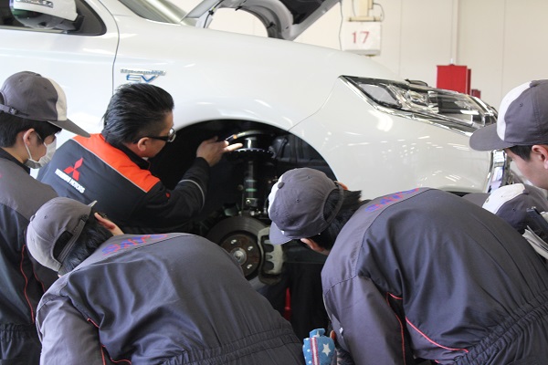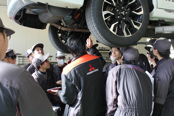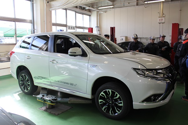 後半の実習では、アウトランダーPHEVを使用し構造や便利性の説明をしていただき、実際にクルマを見ながら構造を学んでいきました。