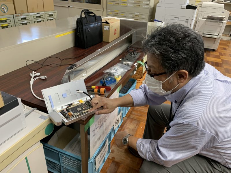 佐藤先生、検温器を修理
