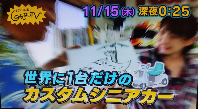 みなさん、11月15日(木)深夜0時25分からの「ピエール瀧のしょんないTV」は、世界に1台だけのカスタムシニアカーという内容です。シニアカーを改造する企画なのですが、実はこの車両の改造は卒業生の前田弘樹君が手掛けています。前田君は旧車を得意とする2輪車のショップのオーナーさんです。是非TVで卒業生の活躍する姿を観てあげてください。(yagawa)