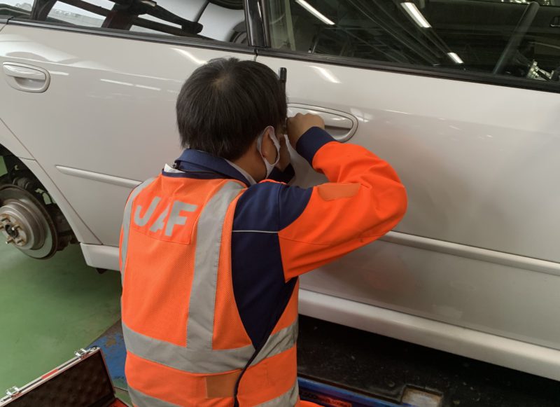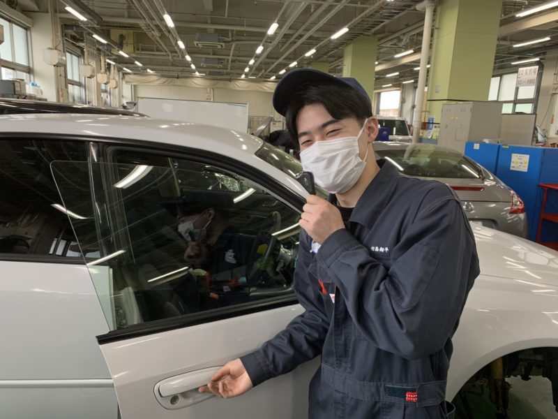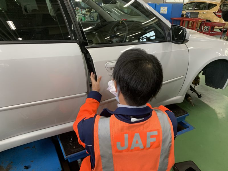 本日、3年生がメインテナンスのために乗り入れた自分の愛車をインロック。ガラスなどを傷つけてもいけないのと本人が会員だったこともありJAFに開錠の依頼。連絡後すぐに駆け付けてくれた隊員さんは本校卒業の太田君。ささっとカギを開け颯爽と帰っていきました。卒業生の活躍する姿!カッコいい!(yagawa)