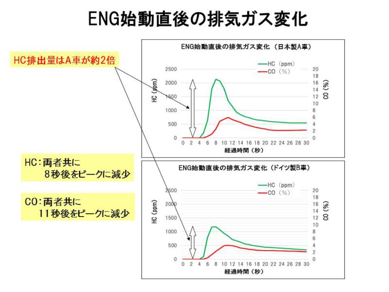7~8秒で触媒が温まり排気ガスがクリーンにはなりませんから、エンジンスタート直後に、燃料の始動増量が働き、7~8秒で解除されたという結果を示していますが、日本製もドイツ製も同じ考え方を示しているというのは大変興味深いです。