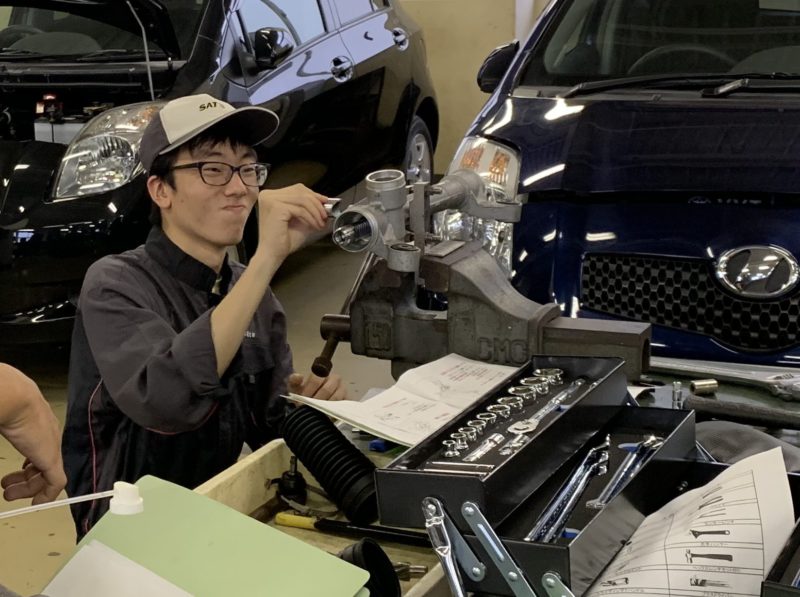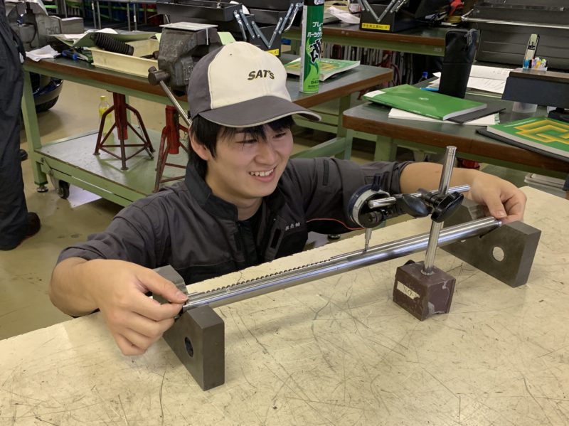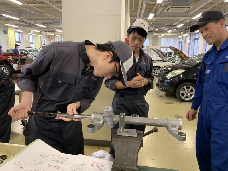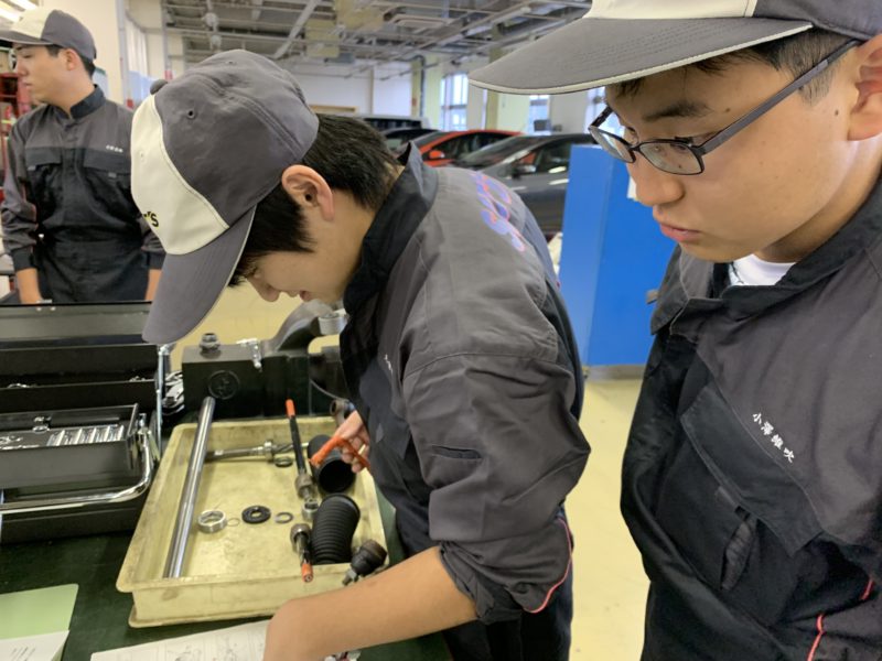実習場では自動車整備科1年の3班の学生たちが、ラック&ピニオンの分解、測定、組み立てをしています。(yagawa)