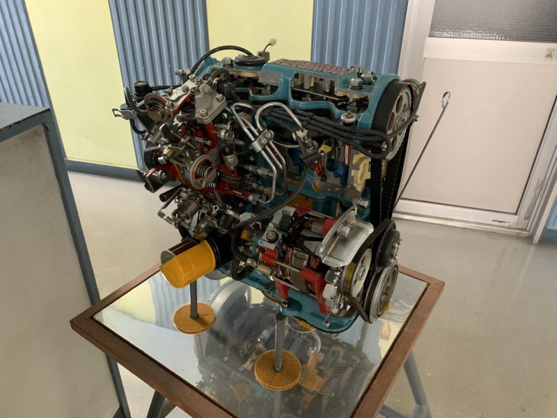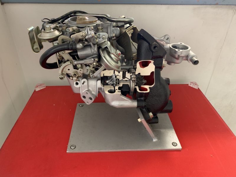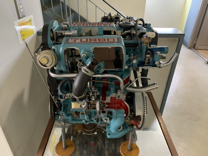 学校内には様々な教材がありますが、C棟の階段室には今では珍しいエンジンや補機類のカットモデルがあります。2階にはダイハツ様から寄贈していただいた3気筒1000ccのジーゼル・ターボがあります。シャレードに載っていたものです。3階には三菱様寄贈のターボのカットモデルがありますが、よく見るとなんとキャブレーターのターボです。全車種ターボを売りにしていた頃のコルディアとかトレディアに載っていたものかなあ?どちらも1980年前後の物だったと思います。懐かしい!みんなわからないでしょうね(yagawa)