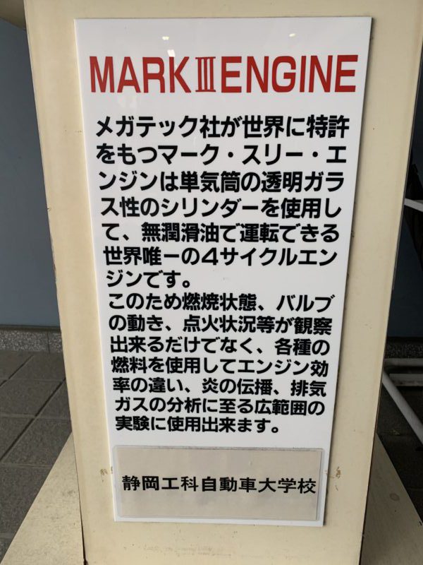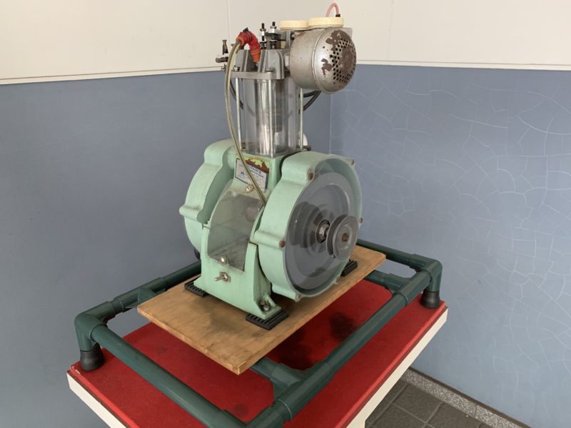 昨日に引き続きC棟の階段室にある教材を紹介します。1階の玄関を入ったところにあるのは通称「ガラスエンジン」です。シリンダがガラス製で中のピストン、コンロッドの動きが見えるのです。バッテリを繫ぎ燃料を入れて、(手動ですが)クランクシャフトを廻してあげるとエンジンを始動することが出来ます。エンジンが掛かると早すぎてピストンの動きは見えませんが燃焼の状態を観察することができるんですよ!(yagawa)