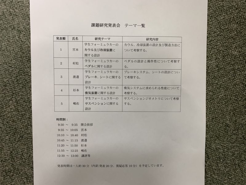 本日ハイエンジニア研究科による課題研究発表会が開催されました。これは今年1年間学生フォーミュラーに携わってきた2年生がそれぞれの設計パートについて作業内容を説明し考察するというもので、卒業する5人が1人30分の持ち時間で発表しました。発表後の質疑応答では次年度引き継ぐ1年生たちもうまく引き継がれ活用されていくであろう有意義な質問や、それに対する解答がありました。改めて研究・開発というものづくりの面白さが感じられる発表会でした。(yagawa)