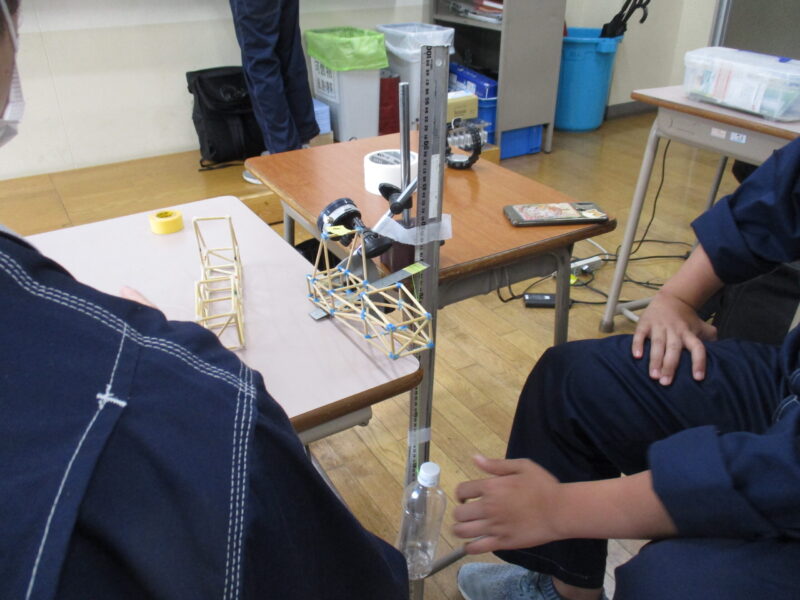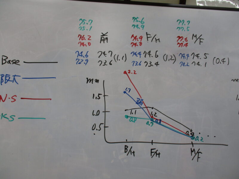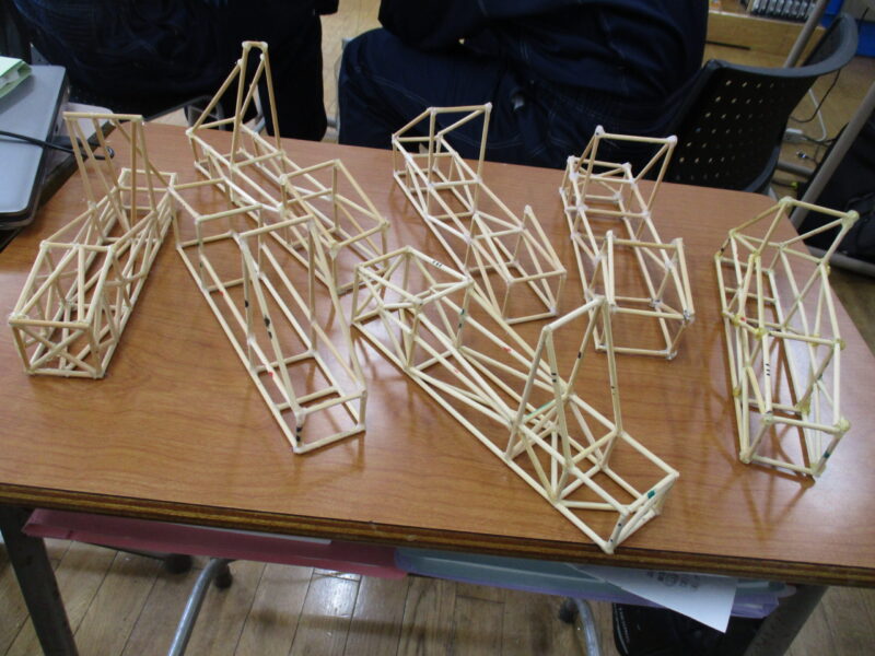 今日はいくつかのフレームの案から竹ひごのスケールモデルを作成し、そのフレームのねじり剛性を測定しました。方法はフレームの共通ポイントを固定、そこから決められた長さのポイントにアームを取り付けてウエイトをぶら下げます。その結果ウエイトを取り付けたアームがどのくらい沈み込むかを測定してねじり具合を数値化するというものです。