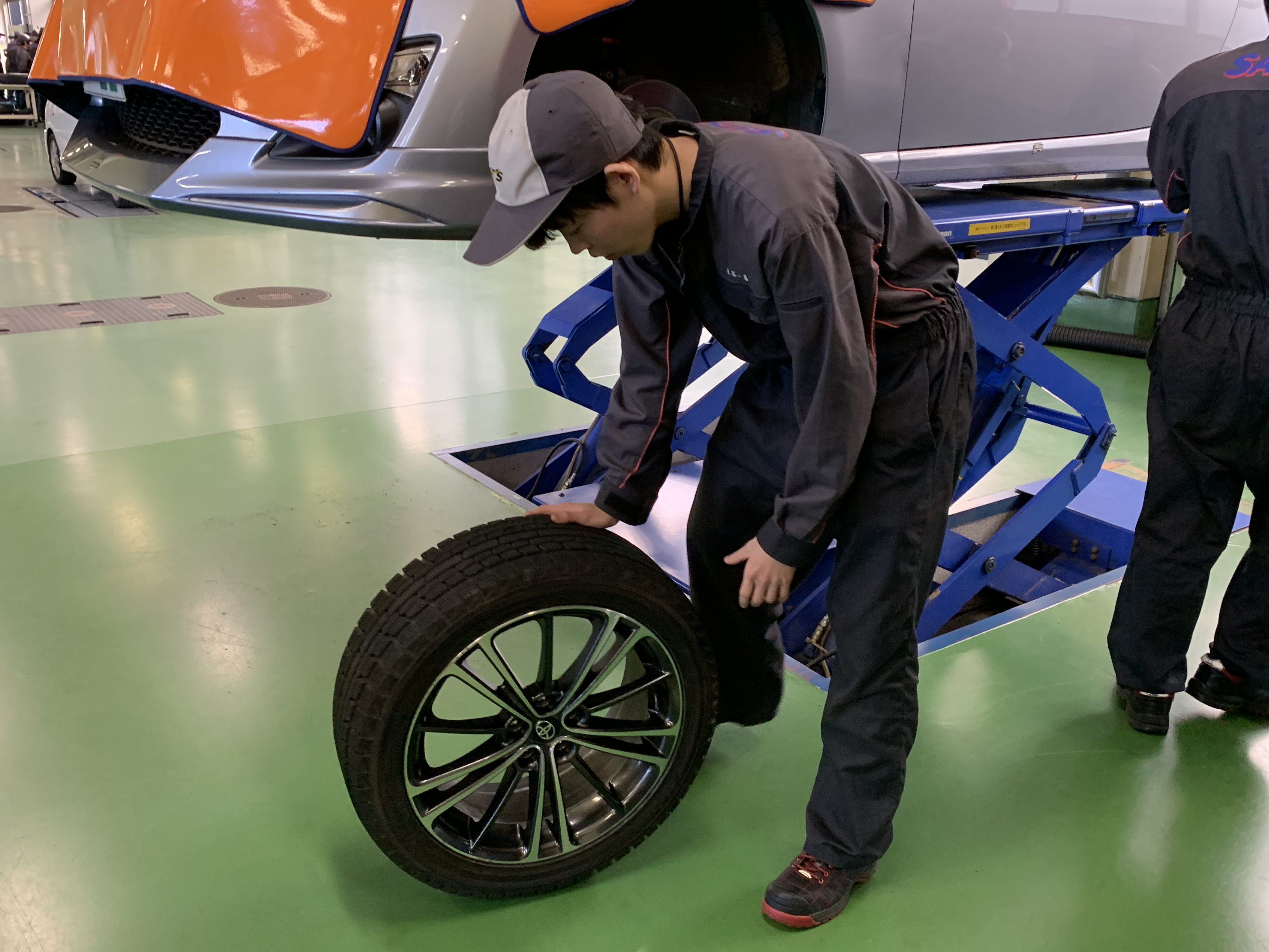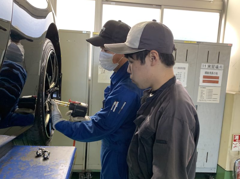 自動車システム工学科と自動車整備科の1年生は3学期になるとフル実習です。今日は自動車整備科1年1班の定期点検実習を行っています。タイヤの外し方のレクチャーを受けています。「そんなの5つのネジを外すだけじゃん」と思ったあなた!ポイントがいくつかあるんですがここでは書ききれません。気になる方は体験入学でもレクチャーしているので是非!!