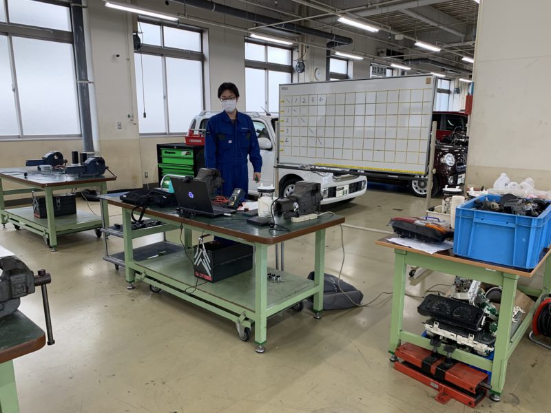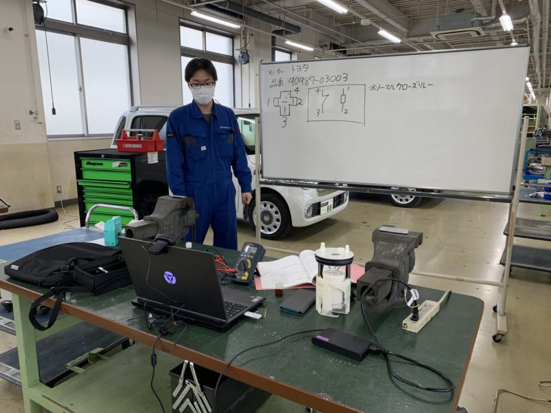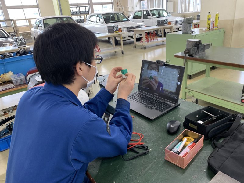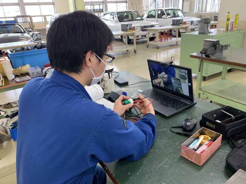 現在各科、学年でWEB授業を展開しています。今日は渡邊先生が1年生に電装の実習授業の様子です。カメラを通じて、サーキットテスタを用いた汎用リレーの各端子間の抵抗測定を行い、その特性を説明しています。あわせてノーマル・クローズ、ノーマル・オープンも抵抗値を示しながら説明しています。(yagawa)