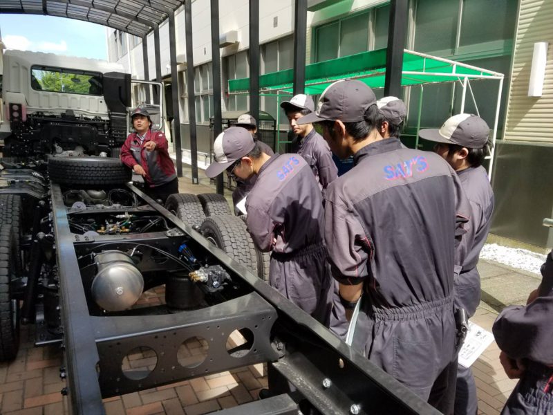 自動車整備科・自動車システム工学科の2年生が受講する「企業様を招いての実習授業」。7日にお越しいただいた企業様は三菱ふそうトラック・バス株式会社様です。今回も自動車整備科の学生の受講です。2Fの学生ホールで座学説明を受けたのち2グループに分かれ実習場へ。1グループは大型トラック「スーパーグレート」を取り囲みエアシステムを系統立てて学んでいきます。もう1つのグループは実際にコンプレッサの分解・組み立てを行い構造を学びました。(yagawa)