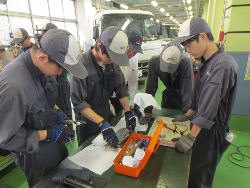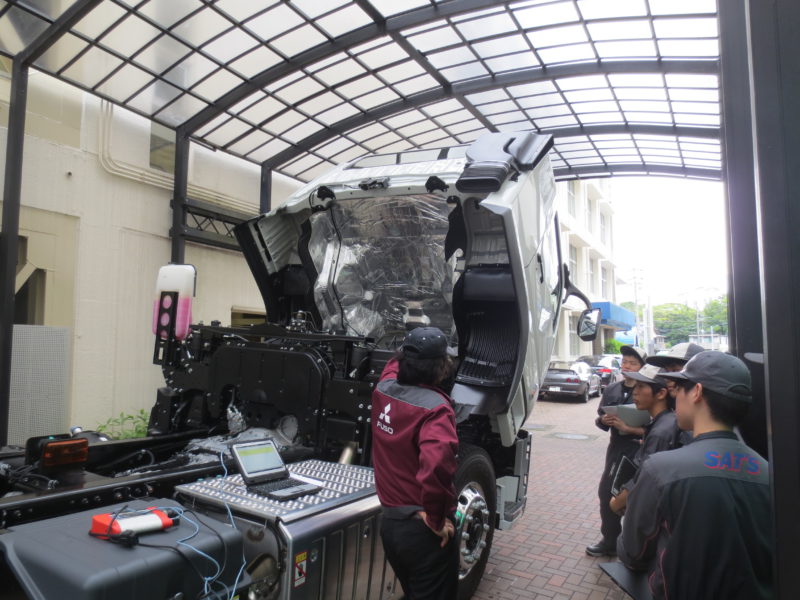 自動車整備科・自動車システム工学科の2年生が受講する「企業様を招いての実習授業」。7日に引き続き本日も三菱ふそうトラック・バス株式会社様にお越しいただきました。今回は自動車システム工学科が受講しました。2Fの学生ホールでの説明、「スーパーグレート」を囲んでのエアシステム説明、コンプレッサの分解・組み立て実習と今回も非常に興味深い1日でした。(yagawa)