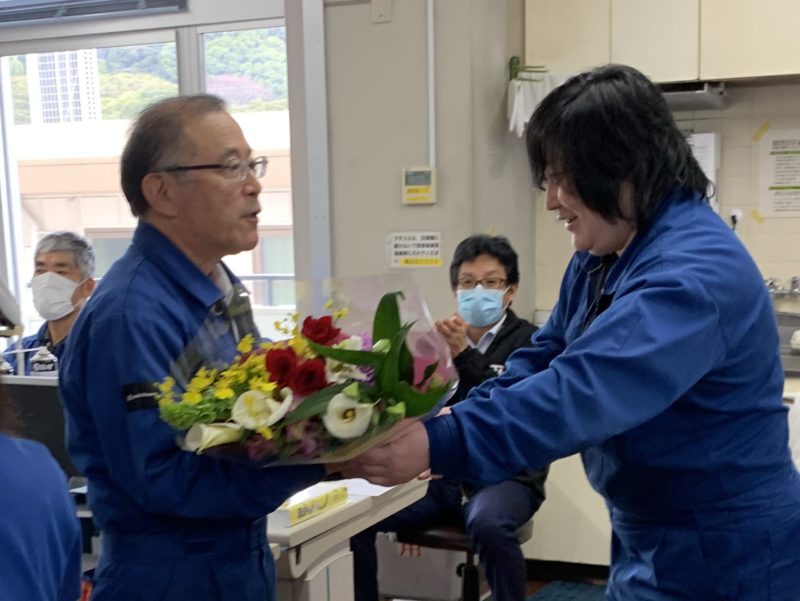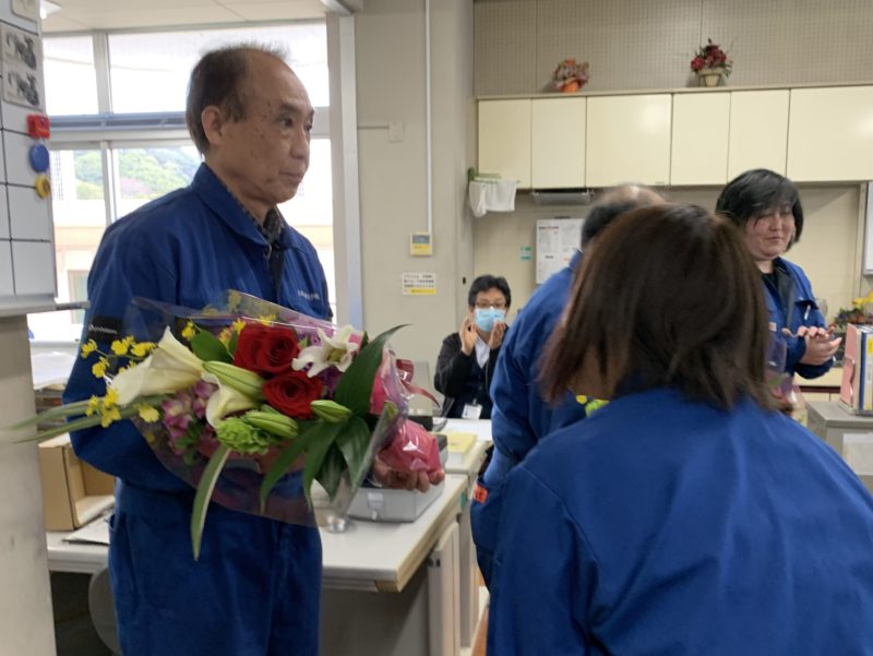 本日、實石先生が最後の出勤になるので、昼休みに職員室で女子職員より花束をお渡ししお二人からお言葉をいただきました。