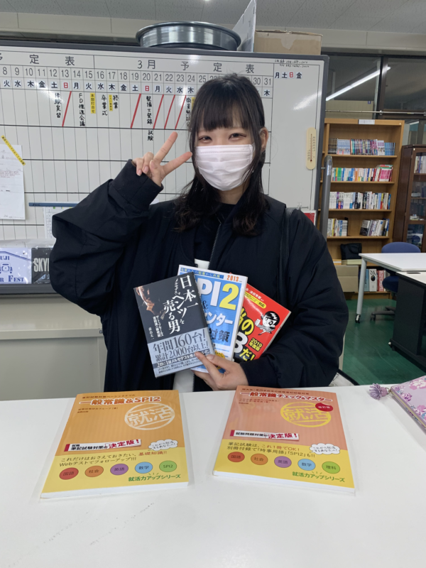 来春卒業の学生は今が就職活動真っ只中。そんな中22日の放課後、自動車整備科の海野さくらさんから就職試験対策でSPIなどの学校の図書を借りていきたいと申し出が。複数冊あるので「じゃあ持っていく書籍の写真撮っておこう!」となり、冗談でカメラを向けたらピースサインでにっこり!ならばとパチッと撮影。撮った写真を見せたら髪型が気に入らないからと、まさかの取り直し。本日試験!もう終わったかな?実力発揮できたかな??(yagawa)