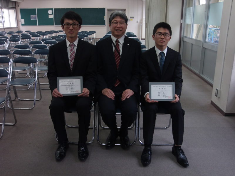 昨日の自動車システム工学科2~4年の始業式と自動車整備科2年生の始業式において昨年度末実施した工科検定で準1級に合格した7名、3級に合格した2名がそれぞれ校長から表彰されました。1枚目は準1級の合格者(前列左から大場海渡君、山田大稀君、服部友輝君、嵐田隆浩君、後列左から岡部校長、松浦瑞生君、市川拓哉君、鈴木僚君)2枚目は3級の合格者(左から天野翔太君、岡部校長、澤本晴人君)です。