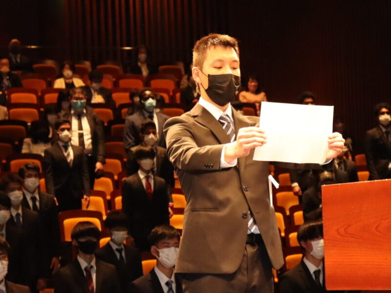 自動車システム工学科、自動車整備科、国際オートメカニック科の全3学科176名の呼名、入学許可ののち、学校長、理事長のご挨拶等があり、新入学生を代表し自動車システム工学科の瀧風雅君が「誓いの言葉」を読み上げてくれました。