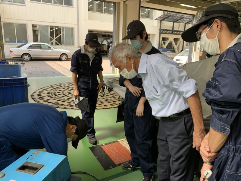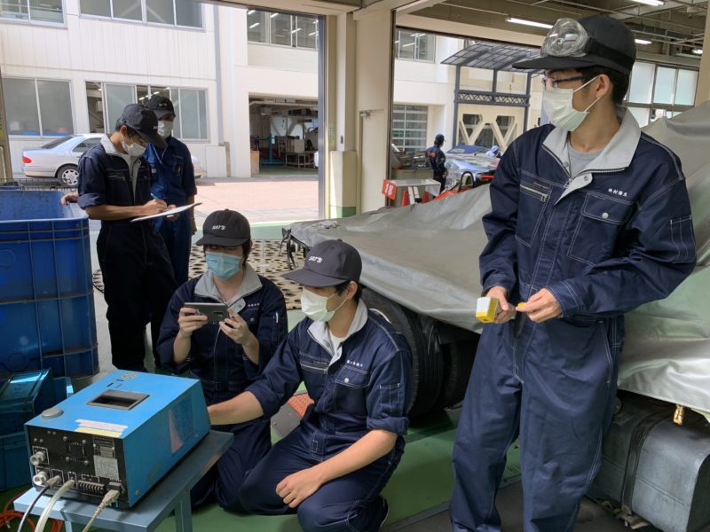 開発エンジニアコース!月曜日は講師の松浦先生の授業です。今日はエンジン暖気状態の変化により排気ガス中のCO&HC濃度がどのように変化するかを実証実験しています。1名がエンジン始動係、1名がタイムキーパー(1分ごとのデータを取ります)もう1名がCO・HCメーターの動画撮影、1名が排気管の温度測定、1名が温度の記録といった具合です。こののち触媒付きの車両も同じように測定してデータの比較、考察をしていきます。(yagawa)