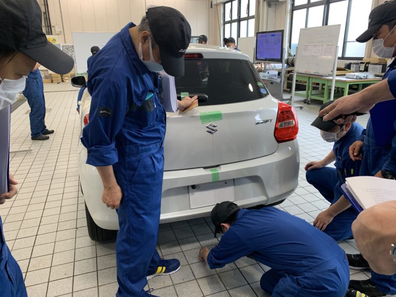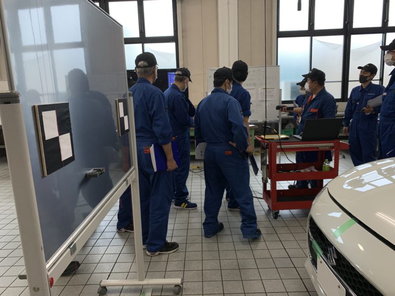 午後はスズキ車を教材に、ステレオカメラタイプ、デュアルセンサータイプ、赤外線レーダータイプのそれぞれのエーミング作業の確認及びオートブレーキコントローラーのミリ波レーダエーミング調整を行いました。