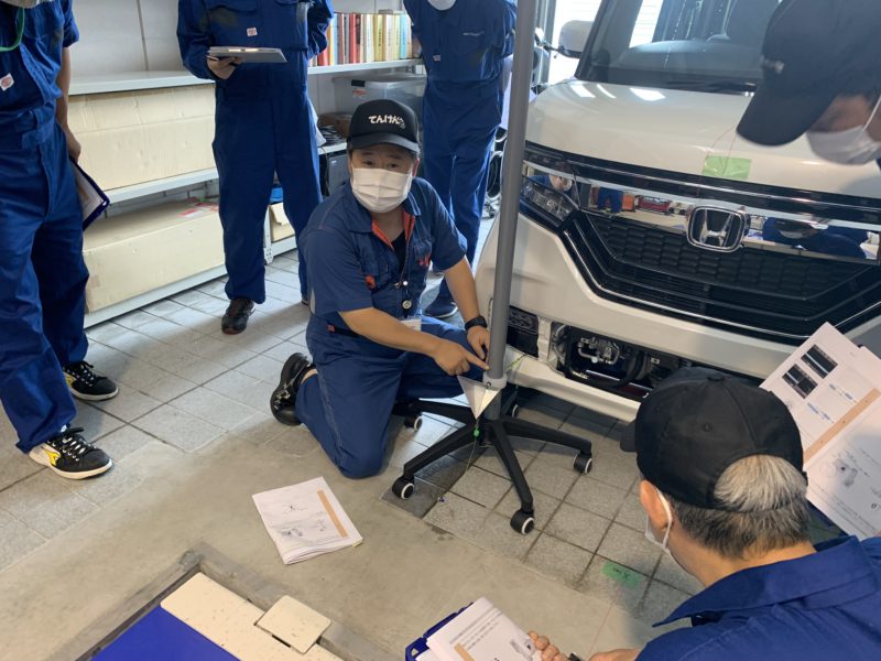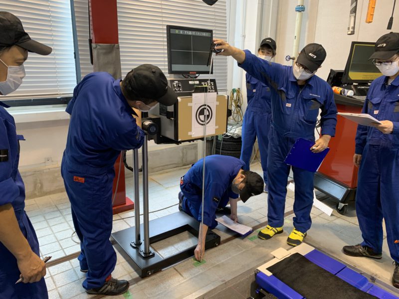 午後はダイハツ車のスマアシⅡのカメラ、レーザーレーダー、スマアシⅢ(次世代スマアシも同様)のステレオカメラそれぞれのエーミング作業(調整はレーダーのみ)、ホンダ車のマルチパーパスカメラ、ミリ波レーダのエイミング調整(ホンダはエーミングでは無くてエイミングというのだそう)を行いました。