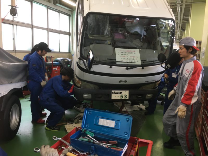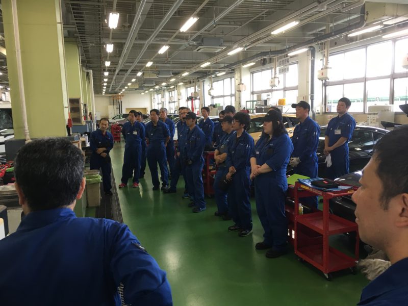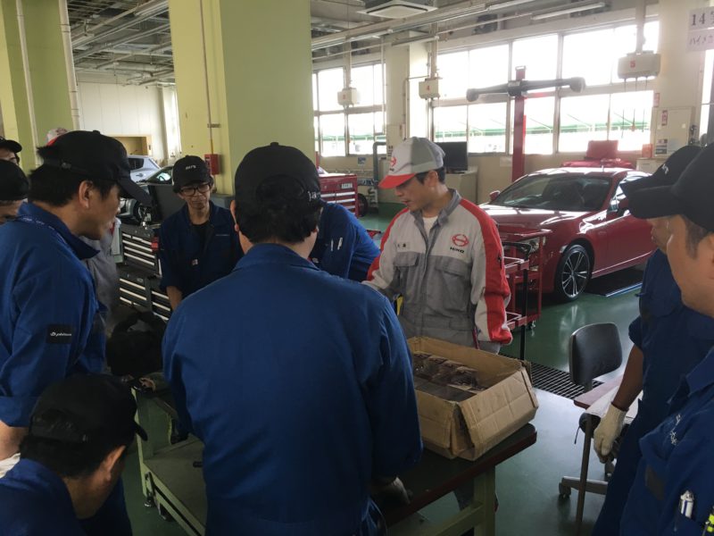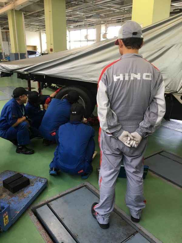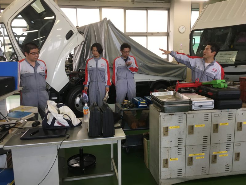 昨日で「巻き上げ機の運転の業務特別教育」は終了しましたが、本日も職員が集まって勉強会を開きました。本日は静岡日野自動車様よりレクチャーを受けます。我々もプロとして自動車整備を教育していますが、日々現場で整備作業されている方の勘どころ、コツといったものも吸収したい!ということで実現した講習です。