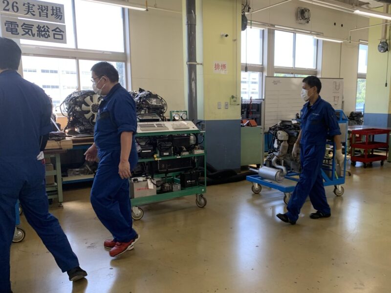 今日は2学期に向けて、職員全体で教材移動です。2学期の実習メニューが変わるので、それに合わせて教材車両の入れ替えや教材エンジンなどのセッティングなどをします。