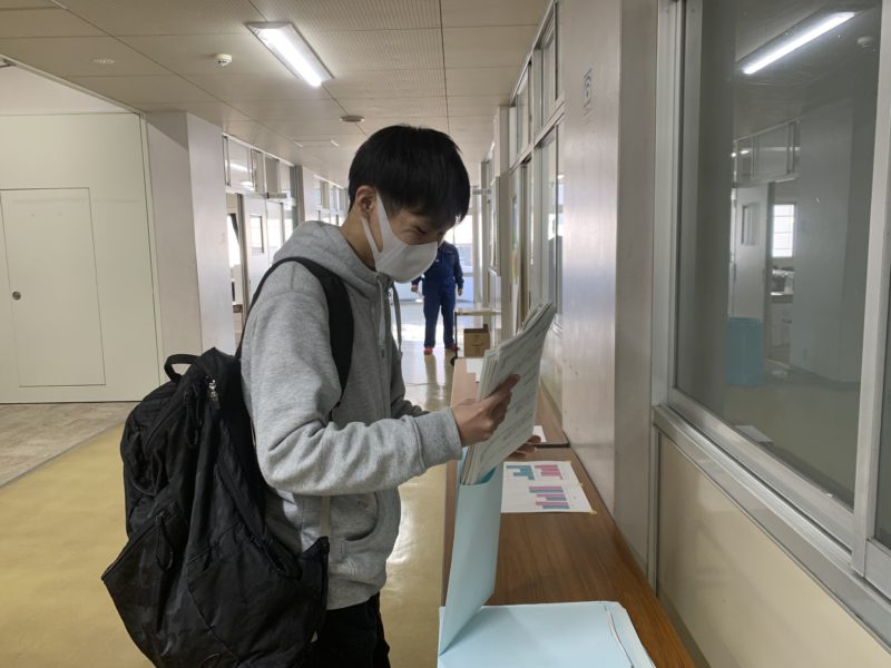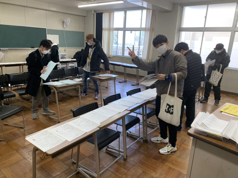 3月に2級自動車整備士試験を受ける自動車システム工学科、自動車整備科の2年生。現在コロナ禍の影響でWEBによる整備士試験対策を行っています。本日、この先2週間分の過去問題&解答用紙を受け取るため久しぶりの登校です。時間差でやってきては大量の資料をまとめて帰っていきます。不利な環境での試験対策ですが、みんな頑張って勉強してくださいね。