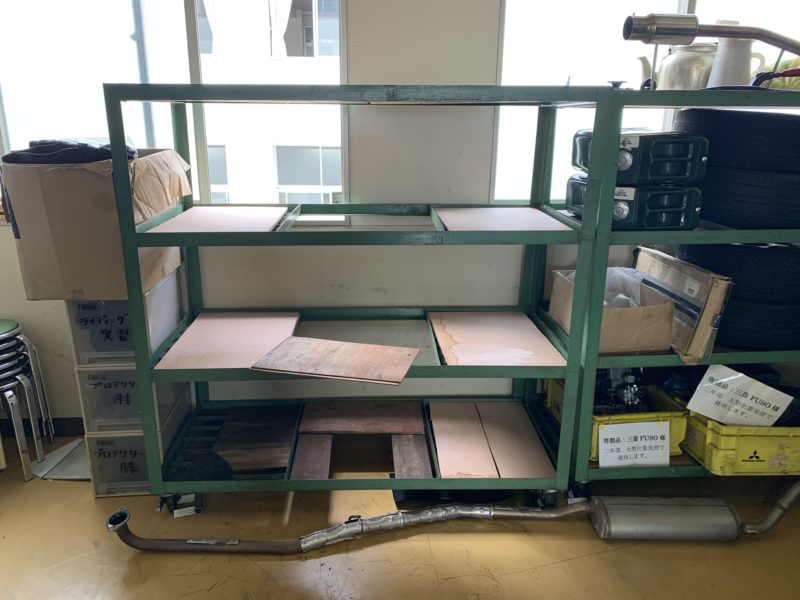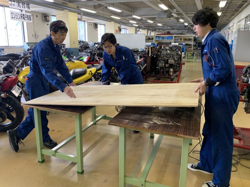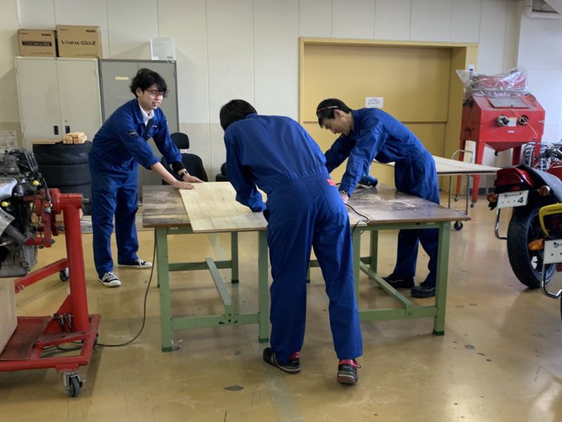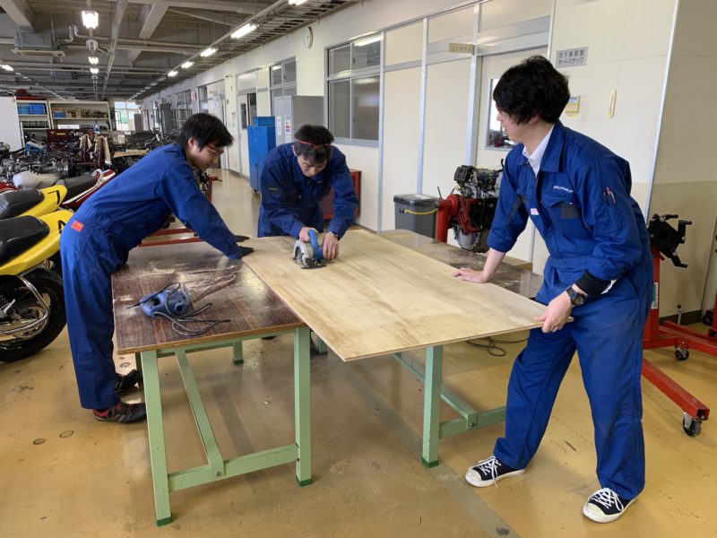 私の居る「広報・学生課」の窓から自動車整備とは違う「ガーッ」という連続音が飛び込んできます。中央通路を挟んだ反対側のC棟3Fへ音の正体を確かめに行くと職員3人で何やら作業中。内藤先生と新任の渡邊先生、鈴木先生が工具室の棚板用のベニア板を切っています。3Fの工具室はデットになっていたので使い勝手を良くするのだとか!新年度に少しでも快適に実習場が使えるよう準備をしています。しかーし内藤先生!指示は出すが作業は・・・(笑)(yagawa)