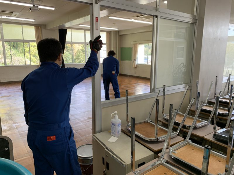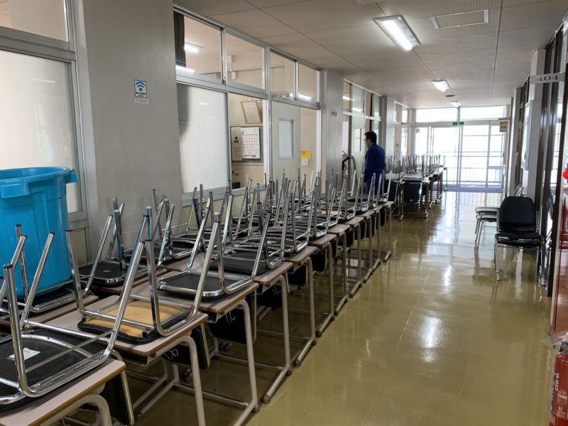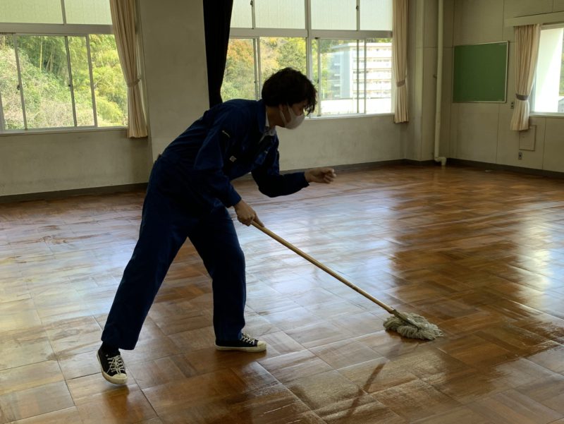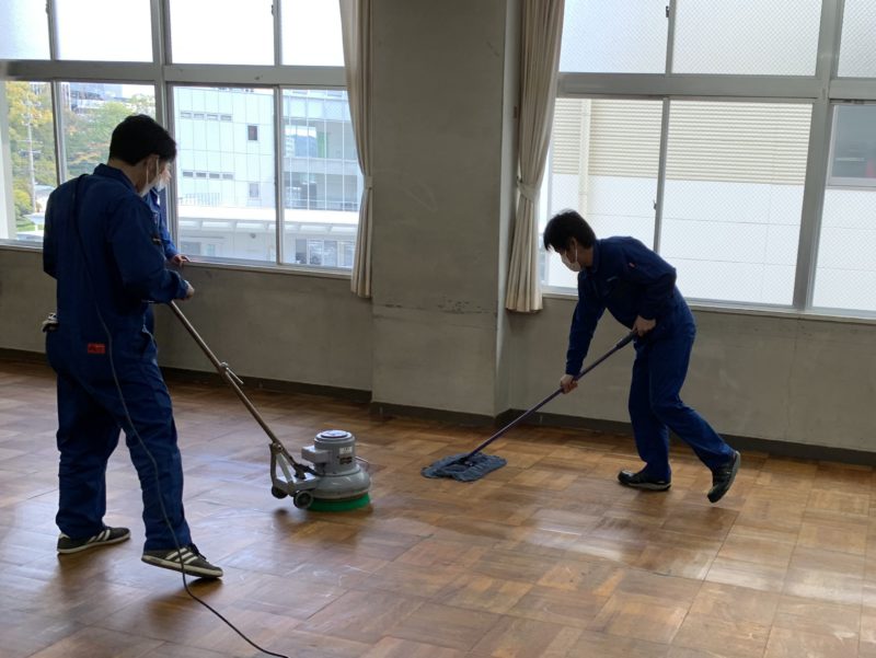 今日「広報・学生課」飛び込んできたのは匂い!そう毎年恒例のWAX掛けです。午前中教室の机を廊下に全部出し、モップでフロアにWAXを塗り込みます。お昼休みをはさんだ午後からは電動ブラシとモップを使い乾いたWAXを磨き上げます。さすが職人技!でも施工しているのは業者ではなく先生方!皆さんマメだし器用です。(yagawa)