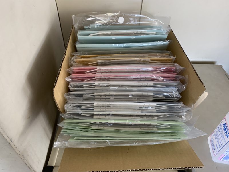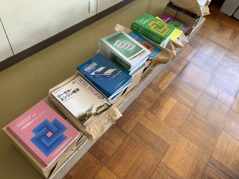教壇の上には新入生に配布する教科書、レポート用紙、ファイルなどが並んでいます。入学式翌日に教室で配布します。お楽しみに!(yagawa)
