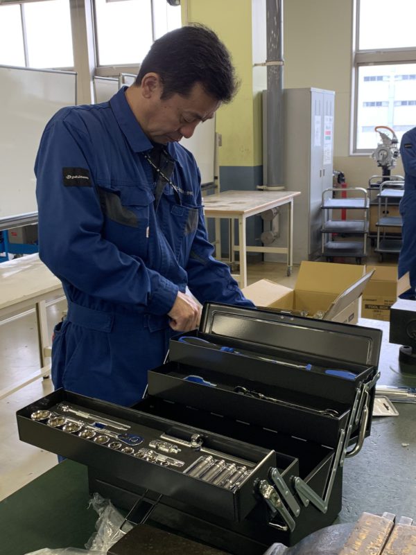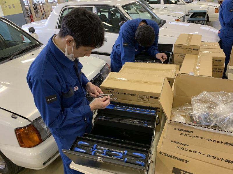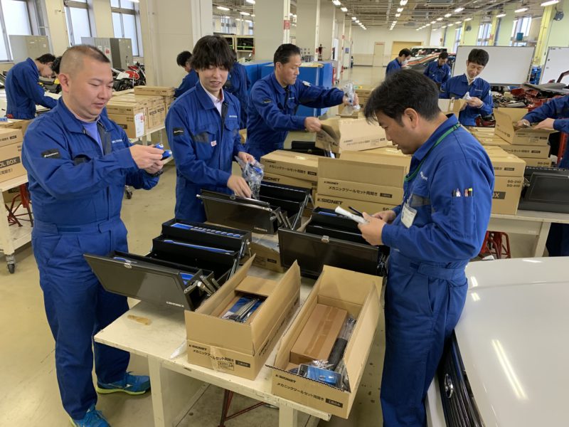 新年度スタートまで先生方は新年度の学生受け入れの準備で大忙しです。実習授業で学生が使用する工具は昨年までは個人購入していましたが、本年度の入学生から学校で準備した工具を貸し出すスタイルに変更しました。本日貸出用の工具が55セット届きました。工具箱と中に入る工具一式がそれぞれ別の段ボールに入って届いたので、先生方総出で1個1個工具を工具箱に収めます。
