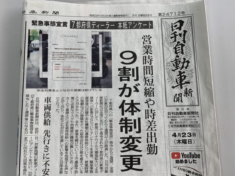 皆さんは日刊自動車新聞をご存じだろうか。様々な業界に専門新聞があるが我々の業界では「日刊自動車新聞」。メーカー、ディーラー、専業さんなどの最新情報やコアな情報が詳しく載っています。本校も当然定期購入しており学生の皆さんも閲覧できる様になっています。3F広報・学生課の前に置かれていますので登校できるようになったら是非ご覧くださいませ!