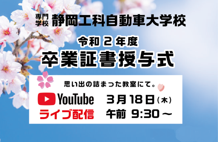 3月18日に予定しておりました「令和2年度静岡工科自動車大学校 卒業式」につきましては、3月21日の整備士試験に向け全力で頑張っている卒業生、保護者の皆様、関係者の皆様が一同に会する式典は中止し、学科毎に卒業生及び教職員のみによる卒業証書授与式を校内において執り行うことに致しました。