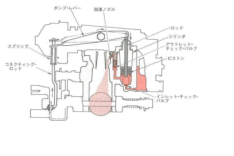 キャブの装置で「アクセルを急激に開くと混合気が一時的に薄くなる」のを防ぐために設けられているのが加速ポンプ(挿し絵)です。アクセルを踏むと連動してコネクティング・ロッドが引き上げられる⇒右のロッドが押し下げられる⇒赤い燃料が加速ノズルから噴射される・・・といった単純なものです。