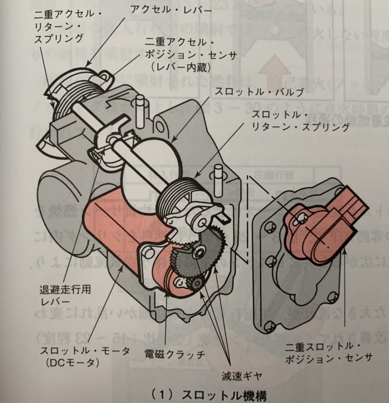 アクセルペダルの開度はワイヤーを通じて、スロットルボディまで来ていてアクセルレバーを回転させますが、その中心軸はスロットル・バルブに直結していません。アクセル開度は二重アクセルポジションセンサで検出⇒ECU⇒スロットルモータ回転⇒スロットルバルブが開く!というものです。
