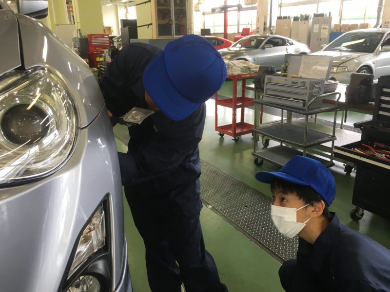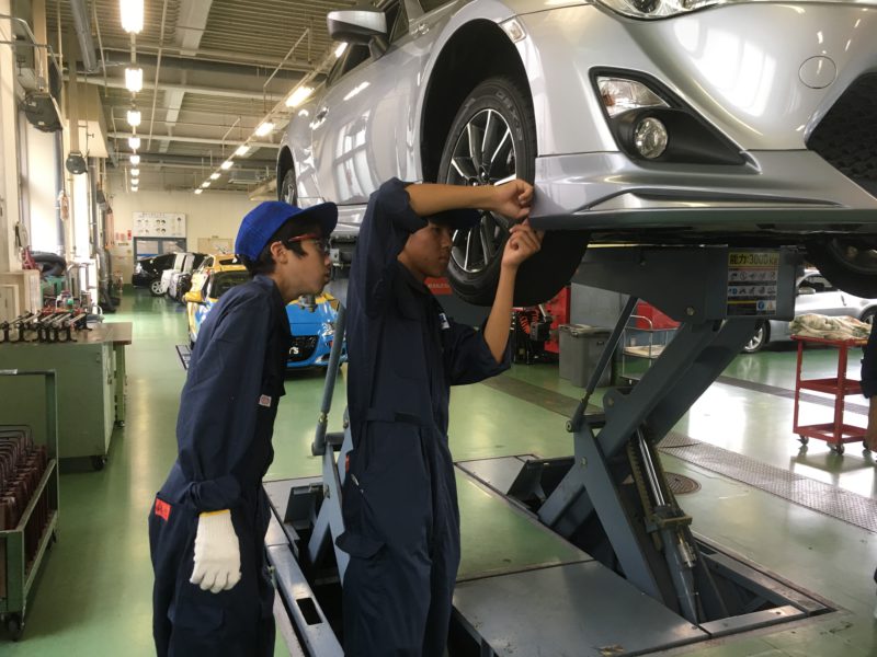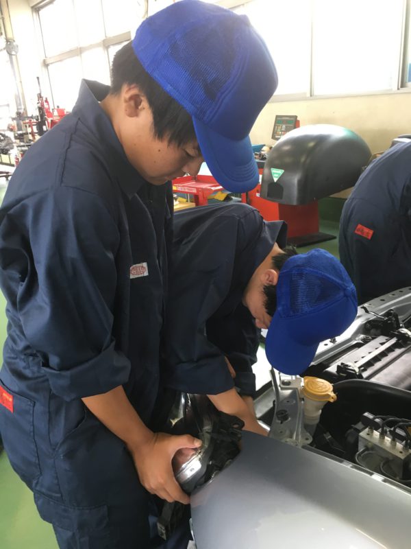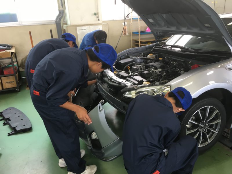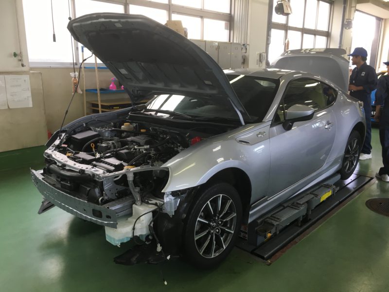 本日はトヨタの86の外装を外す体験から始まりました。それぞれが工具を持ち、指示されたボルト、クリップをはずしていきます。バンパー、ライト類の取り付けボルトは容易にを外れますが、電気配線のコネクターの取り外しには悪戦苦闘していました。