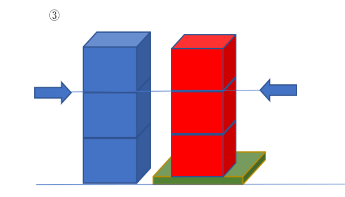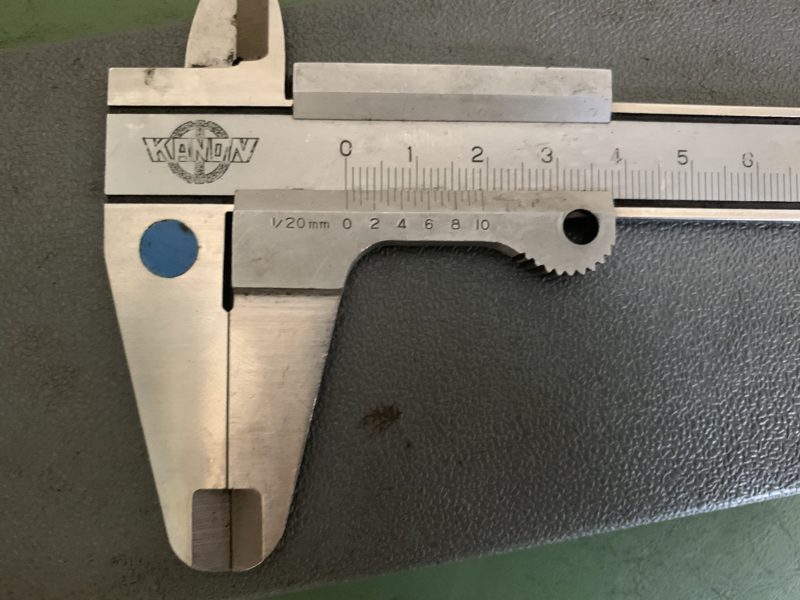 様々な機器・工具の面白さを伝えています。今回はノギスです(写真1)。今回はその原理を・・・青い箱1個の高さを1m、赤い箱1個の高さを0.95mだとします。赤の箱の下に黄色の板が挟まり矢印のラインが一致したとすると、黄色の板の厚さは0.05m(1mー0.95m)ということがわかります。同様に緑の板の厚さは0.10m(2mー0.95m×2)です。ノギスはこの考え方で1mmと0.95mmの目盛を付けた尺の線が一致したところを読んで0.05mm刻みの寸法まで測定できるようになっているのです。最初の写真は左から3つ目の目盛が一致しているのでくちばしが0.15mm開いていることになります。よく考えられていますよね(yagawa)