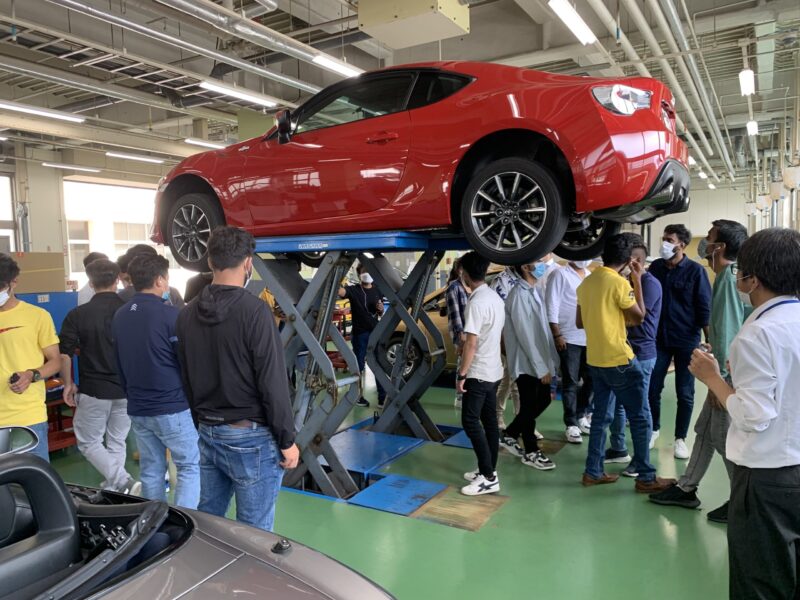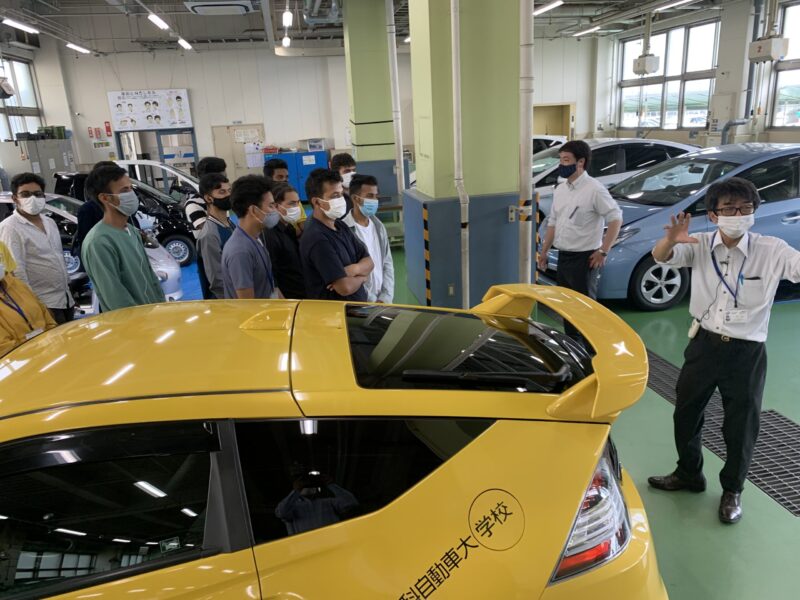本日の午前中、沼津日本語学院の学生さん21名と先生に来校していただき、本校の説明、施設見学等を行いました。今回はクルマに興味のある学生さんが来校したとのことで、工場内では本校の教材車のエンブレムで車名を確認したり、携帯で動画、写真を撮影したり。(yagawa)