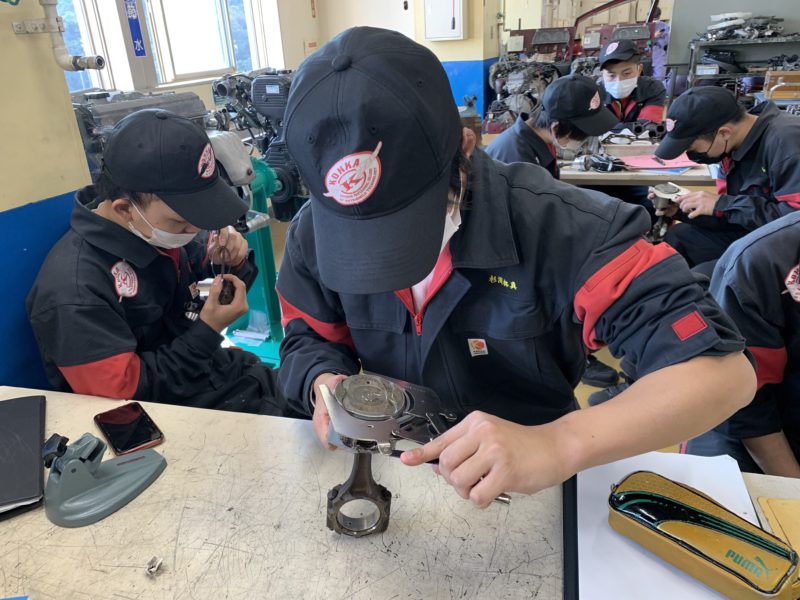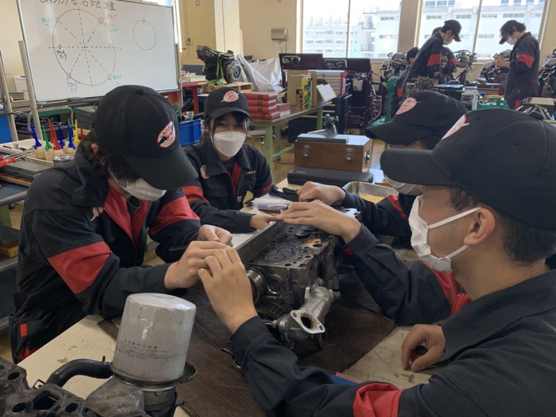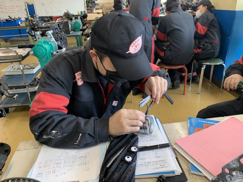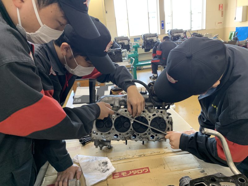 今日は自動車整備科1年生。分解したジーゼルエンジンのヘッドをストレートエッジ、シクネスゲージを用いてひずみ測定をしています。また、全バラのエンジンを使用し、ピストンリングリプレーサーを使ってピストンリングを外し、リング溝とリングの隙間、合口隙間の測定を行っています。(yagawa)