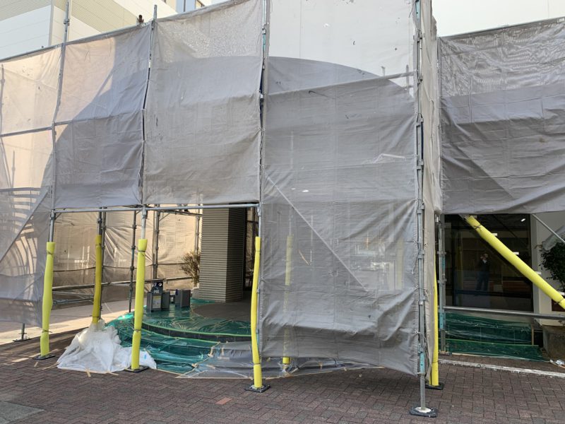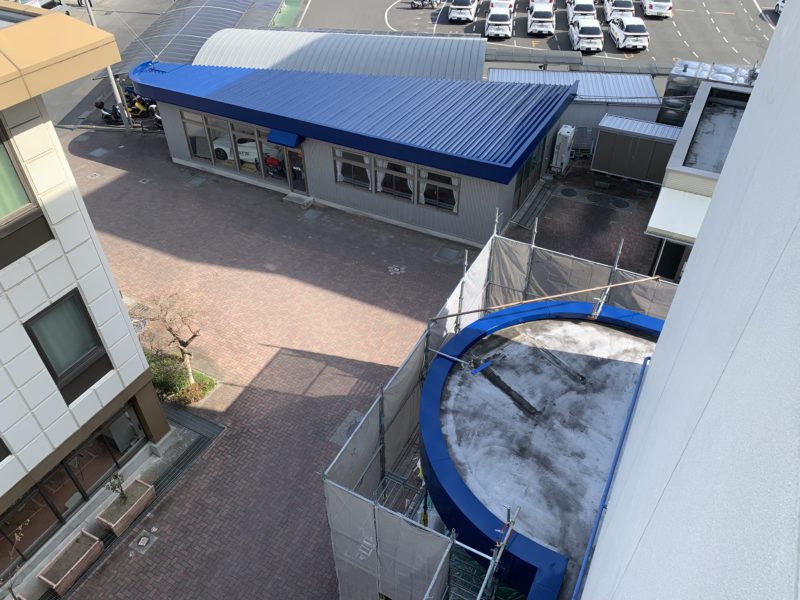 現在、玄関回りのお色直し中。これは玄関のラウンドした庇部分が色あせてチョーキングの状態になったための再塗装を開始(写真1)。以前の状態、まあ十分きれいなんですけどね(写真2)!そしてショールームの屋根もきれいにしました(写真3)。