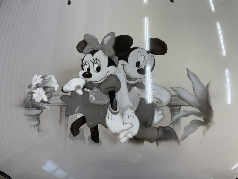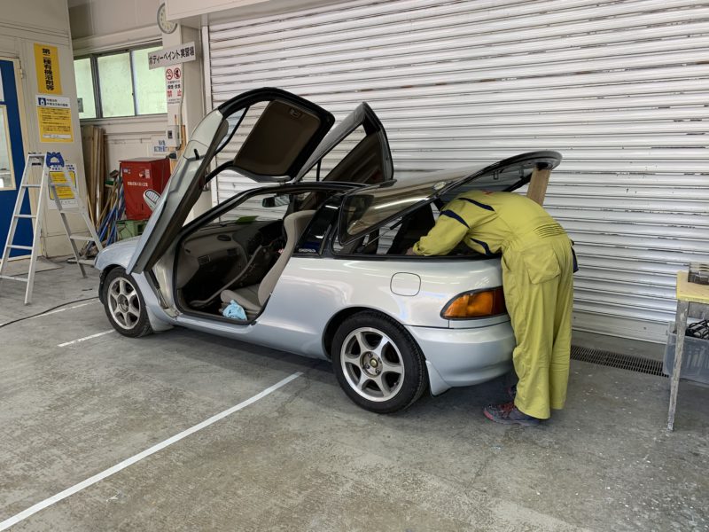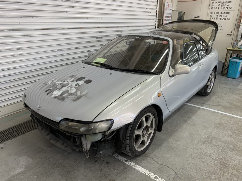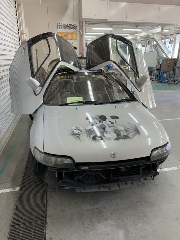 ボディデザイン研究科は既に就業を迎えたのですが、学生達は家の車や自分の愛車の受注作業が仕上がり切らずに、学校で鈑金やら塗装をしています。そんな工場内でひときわ目を引くのが「トヨタのセラ」!純正でガルウイングです。オーナー学生にわざわざドアを開けてもらいました。ボンネットのミッキー&ミニーもかわいいですね!(yagawa)