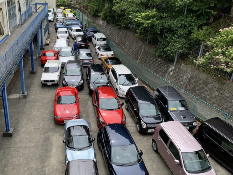学生が夏休みの間に2学期の実習で使用する車両を職員総出で洗車をして実習場に入れます。逆に2学期に使用しない車両は、此処にきれいに収めて、次期に備えるのです。