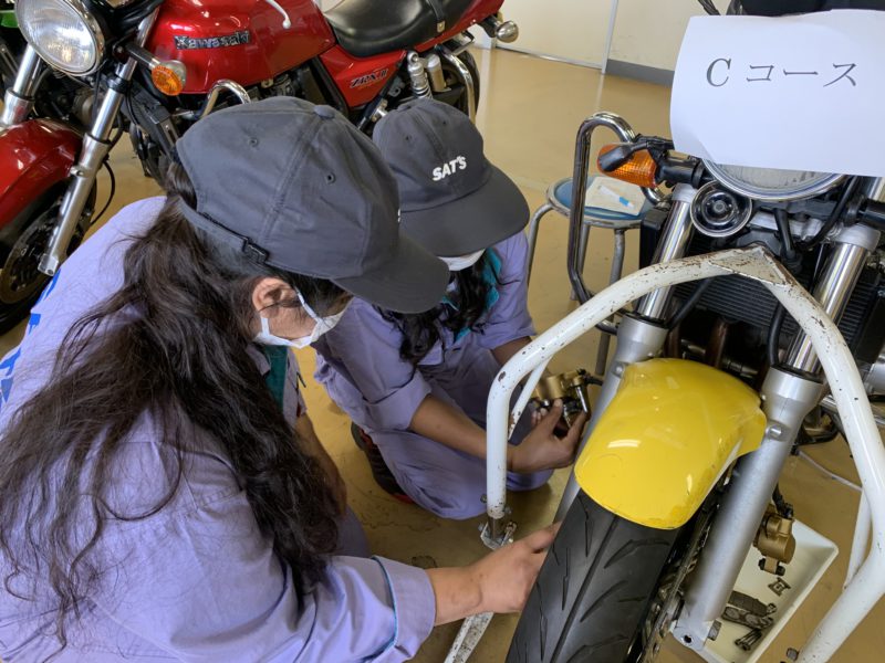 今日の実習風景は国際オートメカニック科の1年生。山下先生のもと二輪車の実習です。伺ったときはパットの交換作業中でした。二人一組で作業をしながら手順を確認しています。コロナ関連の制限が徐々に解除されていく中、ベトナムの留学生はまだ日本に来ることが出来ないのでウェブでの参加です。(yagawa)