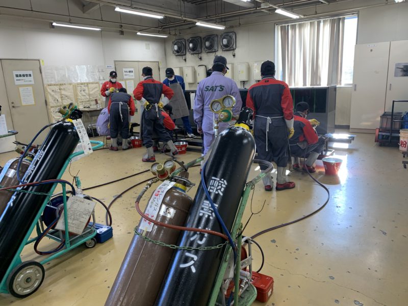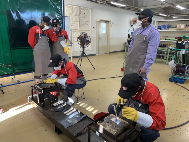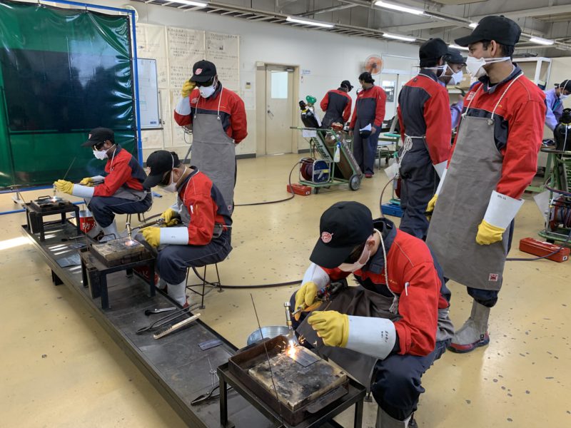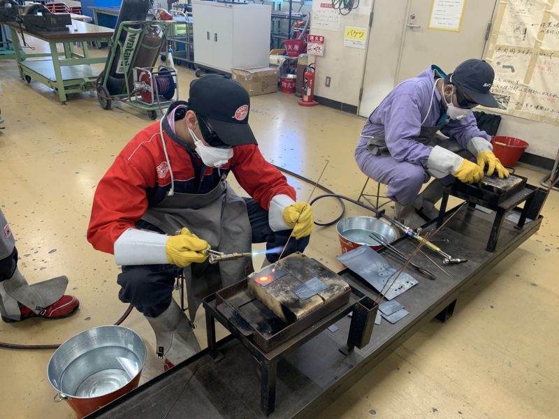 今日は国際オートメカニック科1年生の溶接実習の様子です。アークとガスの溶接技術を習得するのですが、今日はガス溶接の練習で金属ピースを接合しています。スーツで写真を撮りに行ったのですが、ついつい吹管をもって教授したくなっちゃいます。(yagawa)