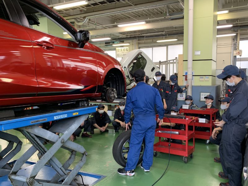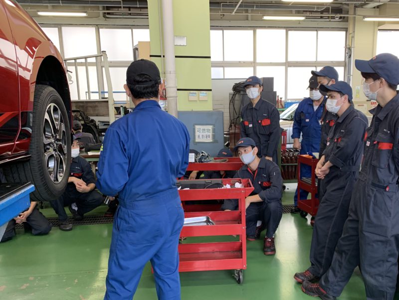 今日は自動車システム工学科3年生の授業風景です。担当の五十嵐先生が既に2級整備士資格を持っている学生に対して、タイヤの脱着やクリップボルトの締め方などの基本から1つ1つ持論を語りながら時間をかけ丁寧に説明しています。3年生になるとメカニックとして登録されてナンバー付車の整備も行います。お客様の大切なクルマをお預かりして、学生に正しい整備をさせなければならないという現場の責任者としての五十嵐先生の真剣さ、責任感の高さをひしひしと感じる場面でした。それを感じ取り学生達も真剣に聞いています。(yagawa)