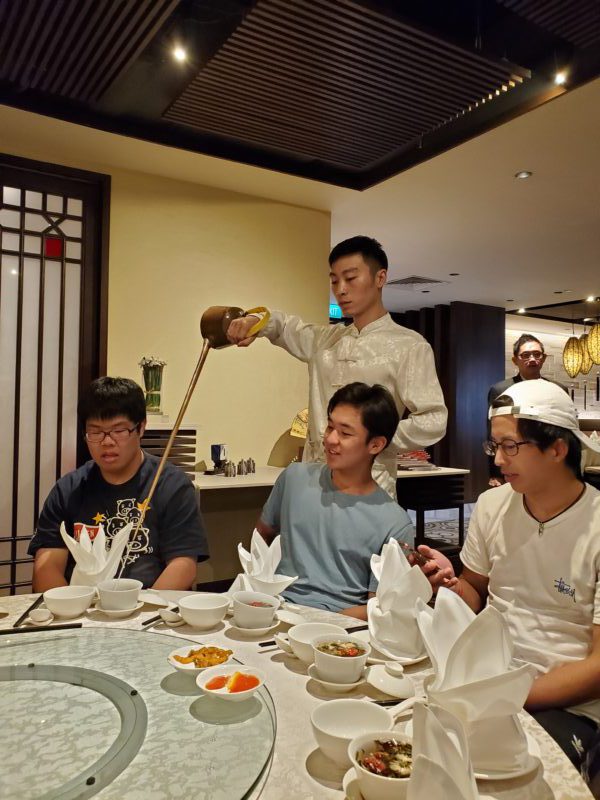 ・昼食は市内レストランにて飲茶のコースを楽しみました。出てきたお茶にいろいろな花や葉が入っておりビックリしましたが、ジャスミンティみたいな味で美味しかったです。