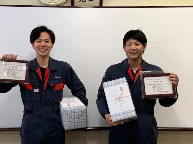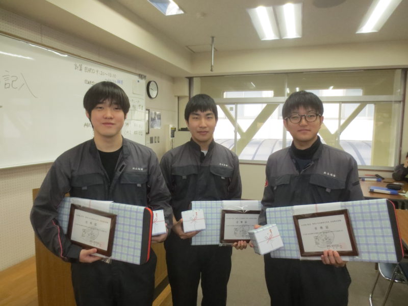 昨年12月に、本校初の試みとして「工科技能検定」という国家検定に準じた本校独自の実技検定を行いました。その結果、自動車システム工学科4年生の2人が1級に、自動車システム工学科、自動車整備科2年生の3人が2級に見事合格しました。本日各々に合格証と記念品が贈られました。1級合格者(1枚目)は左から大畑君、榊原くん、2級合格者(2枚目)は左から杉山君、渡辺君、鈴木君です。