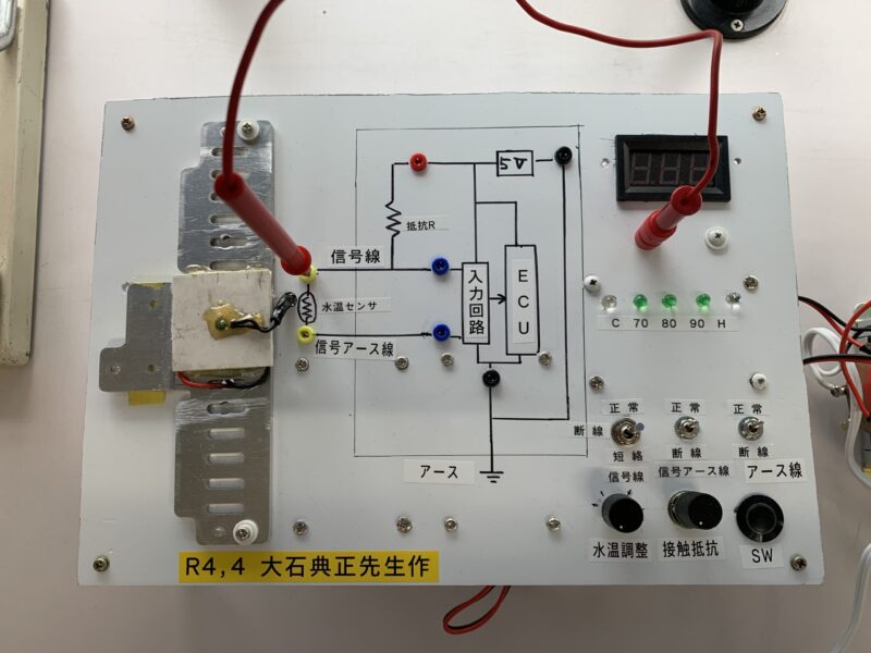 1級担当の中野先生から「水温センサーの項目を学生に説明するのがわかりにくいんですよね!」と相談を受けた大石先生。数日後、水温センサのシミュレータを作成してくれました。水温の変化に応じた信号電圧、各線の断線、短絡による各箇所の数値もちゃんと出る優れものです。中野先生曰く「相談したことすら忘れていたくらいなのに」と大石先生が作成してくれたことにびっくり喜んでいました。敬意を表して作成者の名前シールを張り付けたようです。(yagawa)